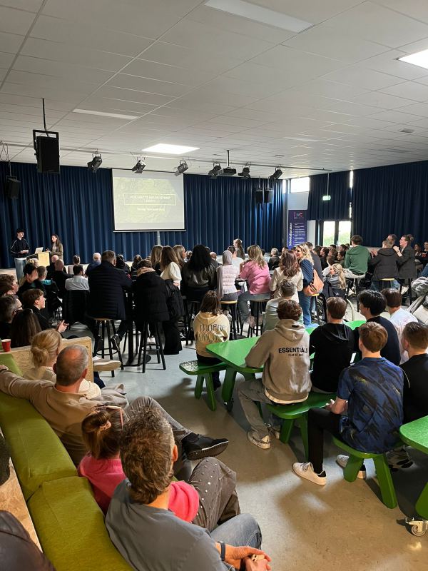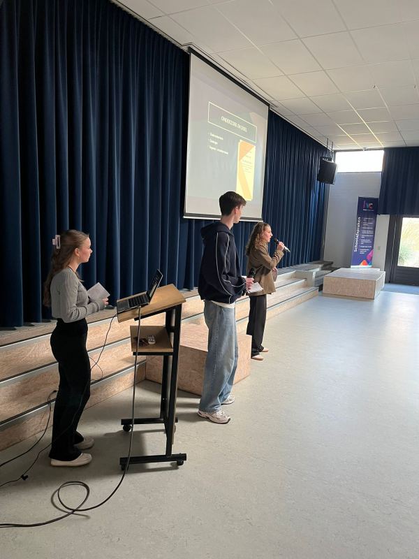 Op 3 maart jl. was het tijd voor alle leerlingen uit 5-havo en 6-vwo om hun profielwerkstuk te presenteren. Ook Sven, Luna en Evine deden dit op het podium in de aula van de school. De documentaire werd getoond aan een volle zaal; leerlingen, docenten, ouders en zelfs opa's en oma's. Het publiek luisterde ademloos en beloonde de leerlingen met een daverend applaus.